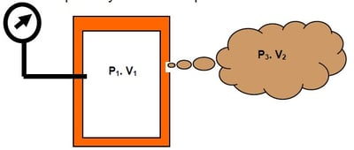 Wenn die Druckluftzufuhr abgeschaltet und das Volumen verschlossen wird und ein kleines Leck vorhanden ist, würde der Innendruck so fallen, dass nach der Zeit t = 1 die resultierende Luftmenge im Behälter dem Volumen V1 und dem Druck P2 entspricht. Man beachte, dass das Volumen unter den Prüfbedingungen als konstant angesehen wird. Die entweichende Gasmenge würde dem atmosphärischen Druck P3 entsprechen und das Volumen V2 einnehmen. Die anfängliche Luftmenge im Behälter zum Zeitpunkt t = 0 (V1 x P1) wird durch die gleiche Luftmenge zum Zeitpunkt t = 1 in zwei Teilen (V1 x P2 und V2 x P3) dargestellt, was durch die folgende Gleichung dargestellt wird: